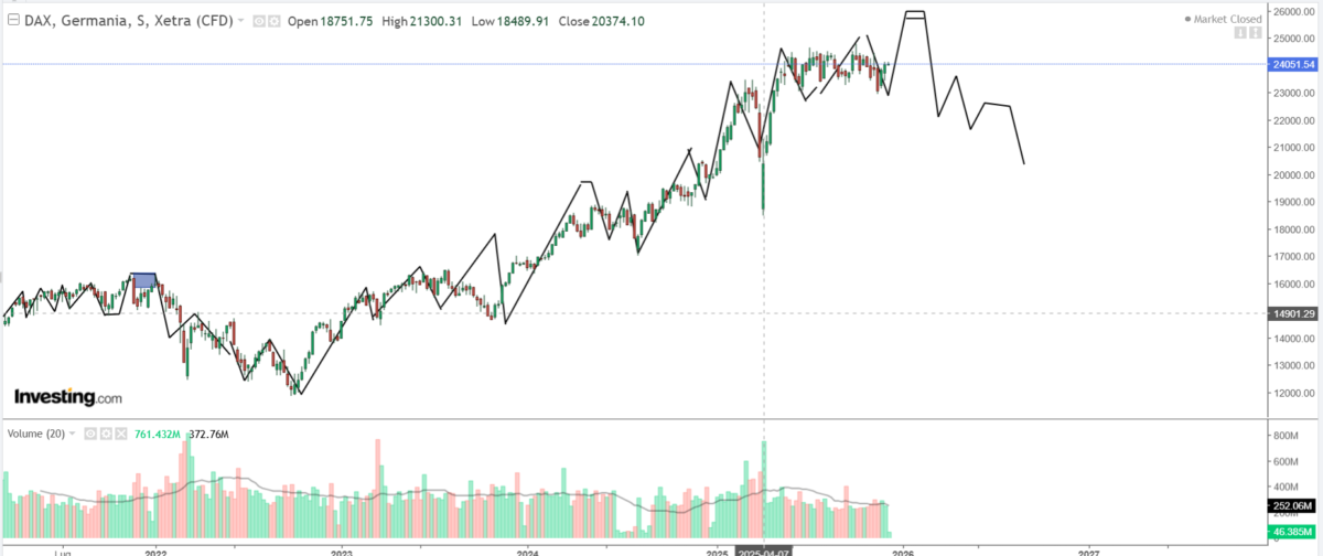 L’indice DAX, dopo aver raggiunto il livello annuale di 24.716 precedentemente indicato ha avviato una fase laterale con un range di circa 1.800 punti