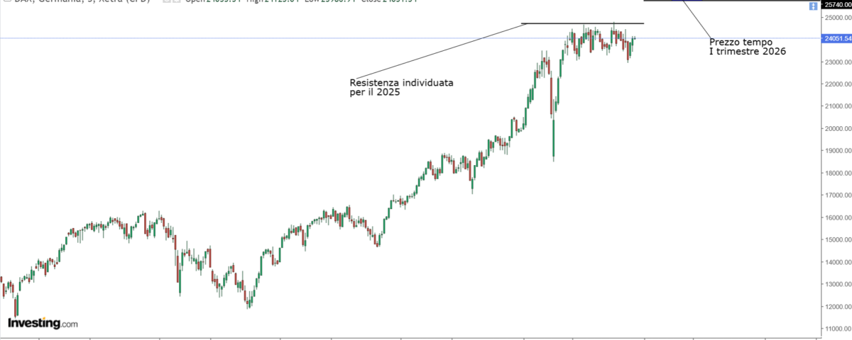 L’indice DAX, dopo aver raggiunto il livello annuale di 24.716 precedentemente indicato ha avviato una fase laterale con un range di circa 1.800 punti