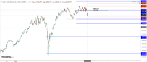 Come ipotizzato, con la perdita dei minimi, l’indice è crollato andando ad intercettare il livello annuale 5880 e mensile 5895 stazionando qualche giorno, l’ultimo giorno di trading ha aperto in gap per soddisfare il prezzo mensile 5840 estendendo di qualche punto la correzione per andare a soddisfare il livello dal top dato da saturno in aspetto con Giove.